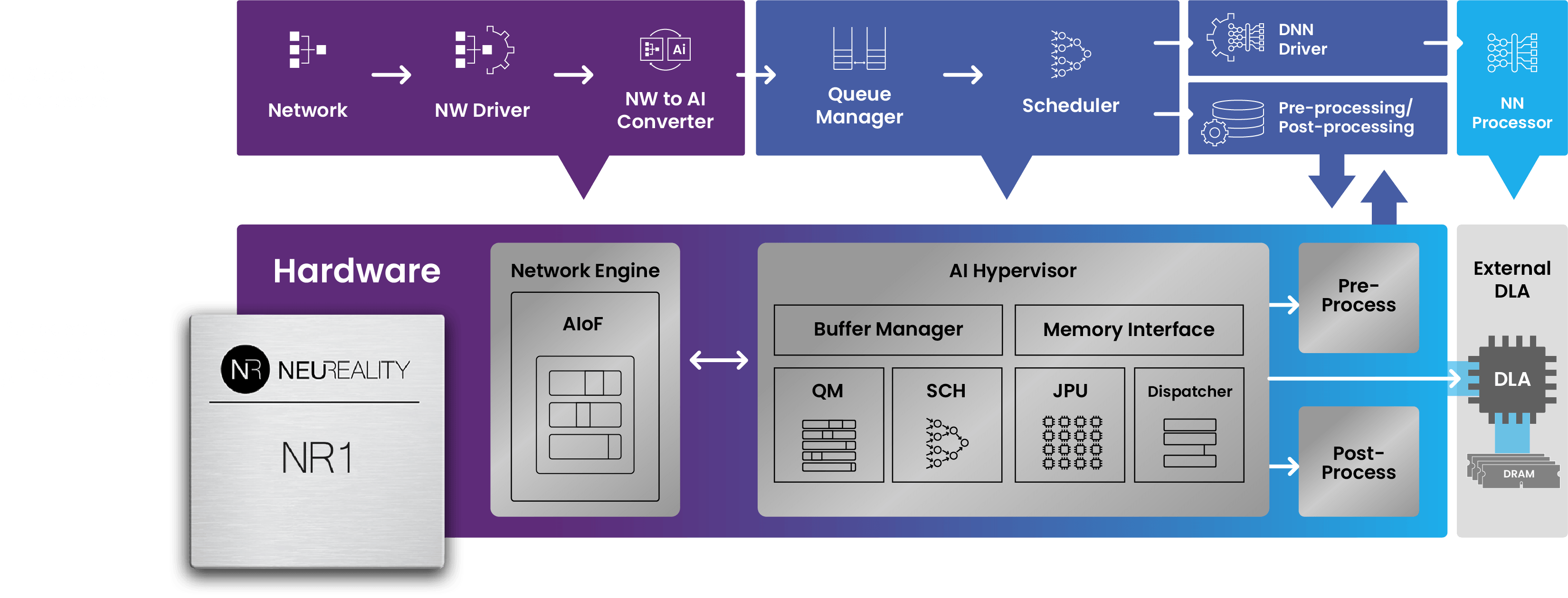 The NR1 Chip connects directly to the network and comes with a built-in neural network engine.